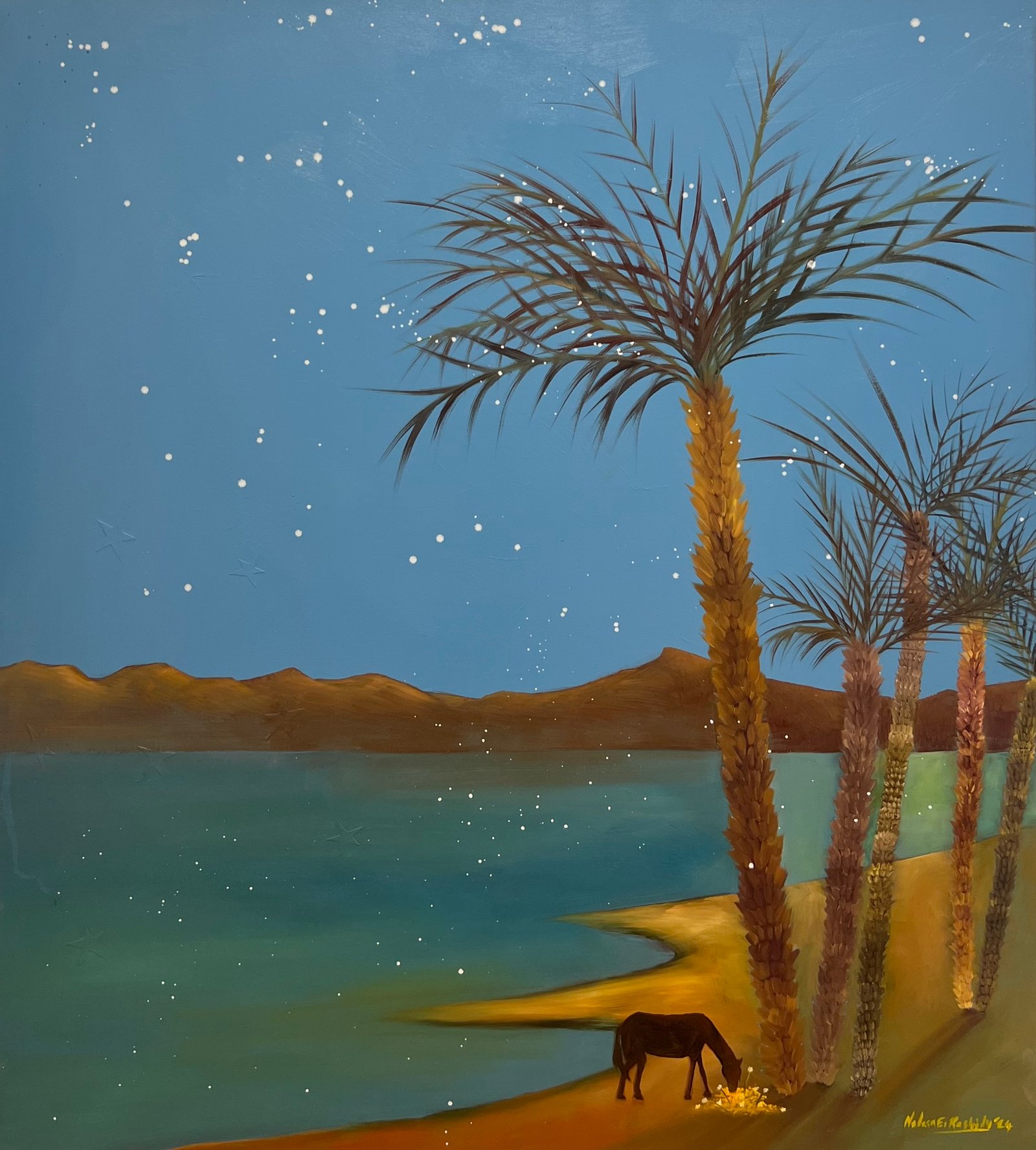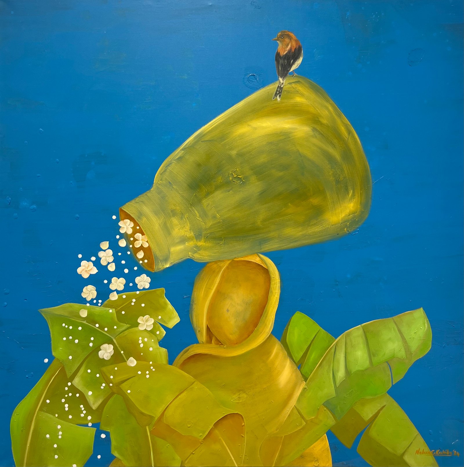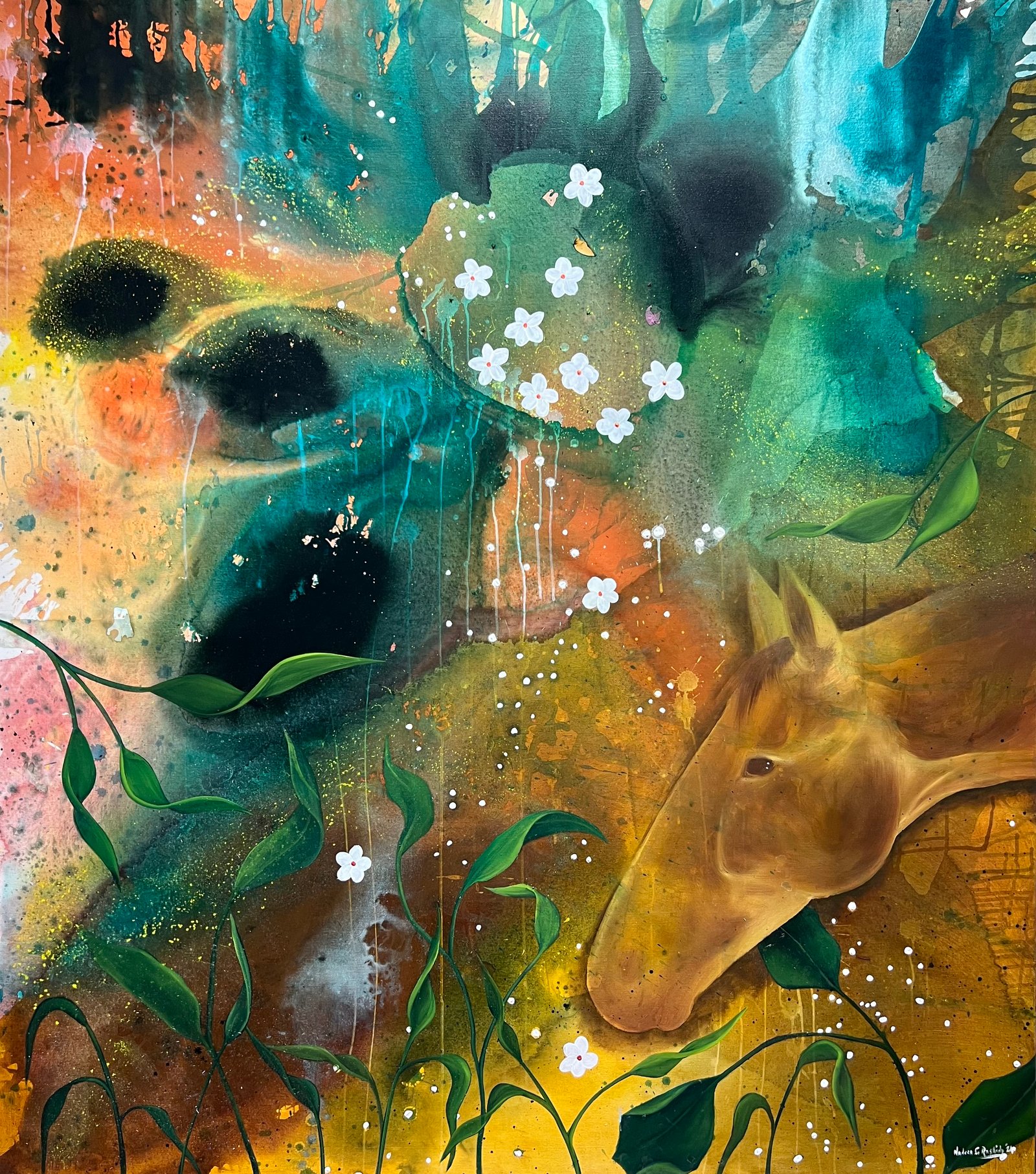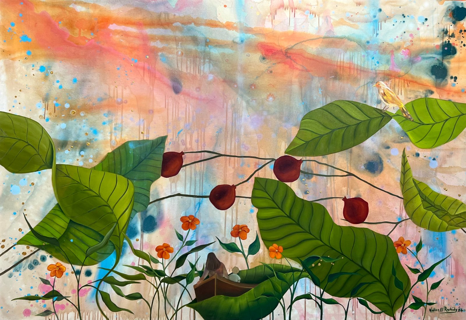 Each canvas tells a tale inspired by the myriad narratives that flow along the banks of the Nile, weaving a tapestry of human experience and connection. Though we may come from different places and belong to different stories, we are all the same. We all laugh. We all cry. We all have pain. And we all have something that keeps us going. Nadeen's paintings serve as a poignant reminder of our shared humanity. As the Nile winds its way through history, it becomes a humble yet powerful symbol of our interconnectedness uniting us in a collective journey of discovery and belonging.